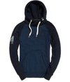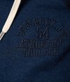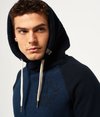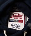 Superdry men’s Applique baseball hoodie. This baseball hoodie features contrast sleeves and a crossover adjustable drawstring hood. The hoodie has a front pouch pocket and ribbed cuffs and hem. Finished with an Applique Superdry graphic logo on the chest, faded team number on the sleeve and a Superdry logo tab on the hood.
