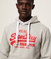 Superdry men's Vintage Logo hoodie. An over-the-head style hoodie featuring a cracked print version of the iconic Superdry logo on the chest. The hoodie also features a drawstring hood and a front pouch pocket. The Vintage Logo hoodie is finished with a signature orange stitch in the right side seam.