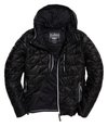 Superdry men's diagonal quilt Fuji jacket. This hooded jacket features an all over diagonal quilt design, a main zip fastening, three zip fastened pockets and elasticated cuffs. Completed with a rubber Superdry logo badge on one sleeve and reflective detailing on the zips.
