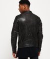 Superdry men’s Endurance Indy customer leather jacket. This premium collarless biker style jacket features a front zip fastening, two zipped front pockets, zipped cuffs and quilted shoulder pads. The jacket has a quilted lining and has a single internal pocket trimmed with leather. The Endurance Indy custom leather jacket is finished with a vintage look and a metal Superdry logo badge on the sleeve.