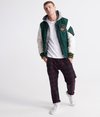 Superdry men's Varsity hooded bomber jacket. A classic varsity inspired bomber featuring a removable drawstring hood with zip fastened placket, a main popper fastening, two front pockets, a single pocket on one sleeve, and ribbed cuffs and hem. Finished with a varsity inspired Superdry patch on the chest, and an all over print on the lining.