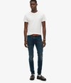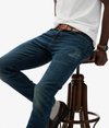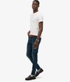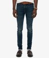 Classic vintage finish with whiskering on the thigh, worn knees and seat, and tonal variations throughout.