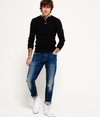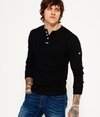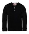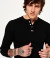 Superdry men's Heritage Grandad top. This classic soft touch long sleeve grandad top features a three button fastening, panelled sleeves with ribbed cuffs and is finished with a Superdry logo patch below the button fastening and on one sleeve.