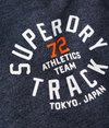 Superdry men's Track & Field Sweat shorts. These sweat shorts feature a drawstring waist, cracked finish Superdry logo prints on both legs, two front pockets and a single back pocket. The Track & Field sweat shorts are finished with a Superdry logo tab on the back pocket.