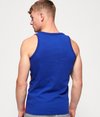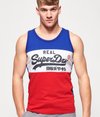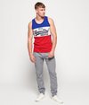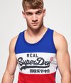 Superdry men's Vintage Logo panel vest. The perfect partner to denim shorts, this vest features a panel design and is completed with a textured logo graphic across the front.