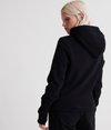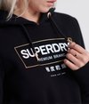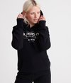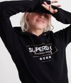 Superdry women's Mono premium band hoodie. This overhead fleece-lined hoodie features a drawstring adjustable hood, a front pouch pocket, and ribbed cuffs and hem. Finished with a Superdry print across the front.