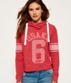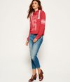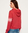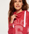 Superdry women's Osaka sport cropped marl hoodie. A soft jersey fabric hoodie featuring a cropped hem, lightweight fleece lining, ribbed cuffs and a drawstring hood with a cross design neck. The Osaka cropped hoodie has an authentic vintage faded Osaka 6 print with striped sleeve bands and is finished with a Superdry logo tab on the cuff.