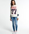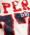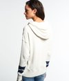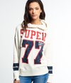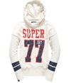 Superdry women's Varsity Slouch Hoodie. This lighter weight hoodie features a Superdry cracked print on the front, two stripe prints above the cuff on each sleeve, two concealed front pockets and a drawstring hood. The Varsity Slouch hoodie is finished with ribbed cuffs and hem, Superdry Athl. logo tab on one cuff and a Superdry badge above the hem.