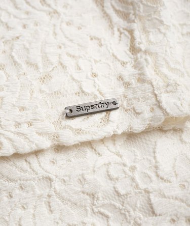 Superdry Women's Eastern lace pencil skirt. A body con pencil skirt featuring an elasticated waist, lace overlay and finished with a subtle Superdry logo on the hem.