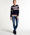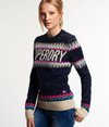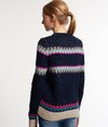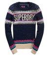 Superdry women's Morzine knitted jumper. This crew neck knitted jumper features a glitter thread knitted throughout the Nordic inspired pattern. The jumper also has ribbed cuffs and hem and is finished with a Superdry logo patch on the left hip.