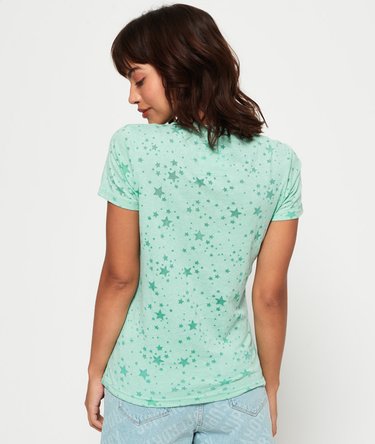Superdry women's Vintage Goods star all over print t-shirt. This lightweight classic fit t-shirt features short sleeves, a crew neckline and an all over star design. Finished with a textured Superdry logo across the chest and a Superdry logo tab on the hem.