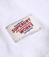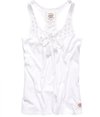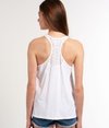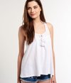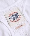 Superdry women's Folk Tassel Vest Top. This racerback vest top is loose fitting and features a broderie Anglaise chest panel with intricate embellishment and tassel neck ties. The vest is finished with a Superdry Works logo patch above the hem.