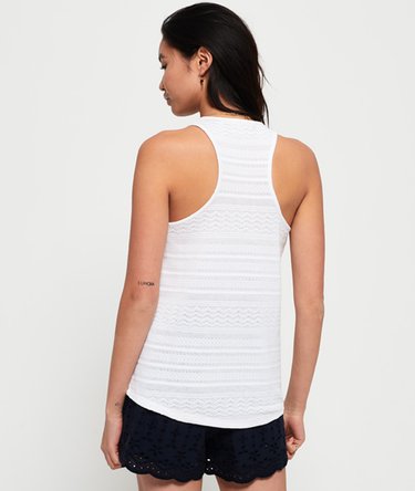 Superdry women's Leya textured vest top. This vest top features an all over textured design and a racer style back. Completed with a Superdry logo tab on the hem. Perfect for the warmer weather and would look great paired with a pair of denim shorts and sandals.
