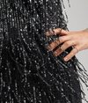 A black dress with silver and black sequins, creating a sleek look that subtly shimmers when it catches the light