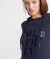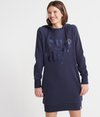 Superdry women Harper hooded sweat dress. This sweat dress features a drawstring hood, two front pockets, ribbed hem and cuffs and a soft inside lining. Finished with a large embriodered Superdry logo on the chest, and a Superdry logo tab on the hem.