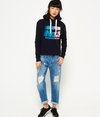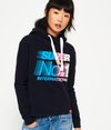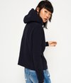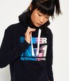 Superdry International Crop Hoodie. This crop hoodie features a crossover hood design with adjustable drawstrings. The international hoodie is finished with a Superdry graphic logo across the chest.