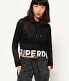 Superdry women’s Mesh crop Hoodie. Perfect for layering this 90s inspired hoodie features an all over mesh design perfect for exercise and casual wear. Featuring an adjustable drawstring hood, the mesh crop hoodie is finished a Superdry logo across the hem.