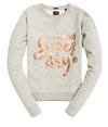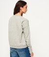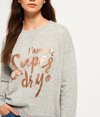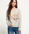 Superdry women’s Northern Lights fashion crew. A crew neck sweatshirt with a puff, metallic acrylic graphic on the front with a ribbed cuff and hem and finished with a Superdry logo tab on the hem.
