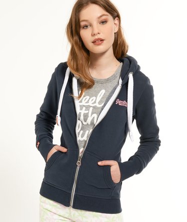 Superdry women's zip hoodie from the Orange Label range. The classic zip-through hoodie with embroidered Superdry logo, drawstring hood, two front pockets and a Superdry sleeve logo tab.