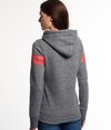 Superdry women's Osaka Brand Hoodie. An over-the-head style hoodie featuring a rubberised print Superdry Osaka logo across the front, printed twin stripes on each sleeve, a pouch pocket and drawstrng hood. The hoodie is finished with a Vintage Superdry logo tab on the cuff.