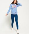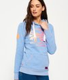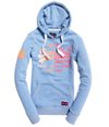 Superdry women’s Shirt Shop fade hoodie. A soft-touch overhead hoodie featuring the iconic Vintage Superdry logo in a fade print across the front with a number print on one arm. To finish, the hoodie comes with a front pouch pocket and an embroidered Superdry logo patch above the ribbed hem.