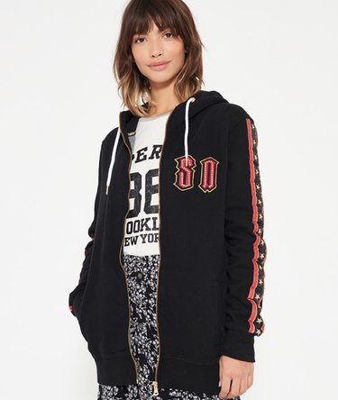 luxury hoodie features a single zip fastening, a drawstring hood and two front pockets to hold your phone and keys. Most importantly, this hoodie has ribbed cuffs and hem to create a flattering fit that sculpts your silhouette and stylish tape detailing down each sleeve for a twist on the classic hoodie. Note those perfect finishing touches, a Superdry tab on the hem, a Superdry patch with rhinestone embellishment on the chest and an embroidered Superdry logo on the hood for a quality finish.