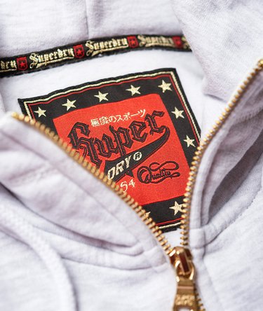luxury hoodie features a single zip fastening, a drawstring hood and two front pockets to hold your phone and keys. Most importantly, this hoodie has ribbed cuffs and hem to create a flattering fit that sculpts your silhouette and stylish tape detailing down each sleeve for a twist on the classic hoodie. Note those perfect finishing touches, a Superdry tab on the hem, a Superdry patch with rhinestone embellishment on the chest and an embroidered Superdry logo on the hood for a quality finish.