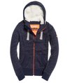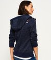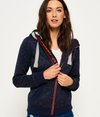 Superdry women's Storm Zip Hoodie. Inspired by mountaineering wear, this zip through hoodie features a drawstring hood with contrasting colour trim, two front pockets and thick ribbed cuffs and hem. The hoodie has a zip fastening with a Superdry logo tab underneath and is finished with an embroidered logo on the shoulder and a Superdry Mountain logo patch on the sleeve.