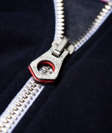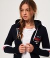 Superdry women's Track & Field stripe zip hoodie. Featuring a drawstring hood, single layer zip fastening and two front pockets. This zip hoodie is also features a Superdry logo on the chest and sleeve and ribbed cuffs and hem. Finished with a Superdry logo tab on the cuff.