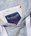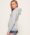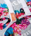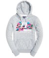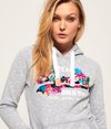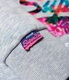 Superdry women’s Vintage logo tropical hoodie. An overhead hoodie that features a drawstring hood, a front pouch pocket, ribbed hem and cuffs. The hoodie has a tropical inspired Superdry logo across the chest with a soft touch flock feel. The Vintage logo tropical hoodie is finished with a Superdry logo tab on the cuff and the signature orange stitching on the side seam.