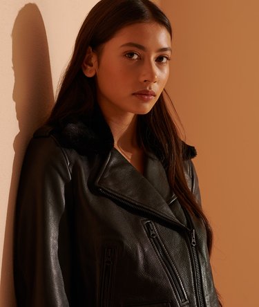 And class and sassiness to any outfit with the Blackout Leather Biker Jacket, featuring a faux fur collar, zipped pockets, small coin pocket, zipped cuffs and metal logo detailing. All made out of 100% cowhide leather.