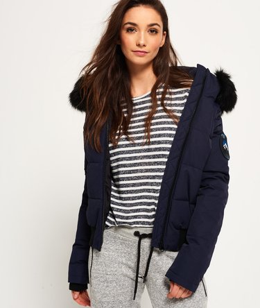 Superdry women’s Everest Ella bomber jacket. This stylish and comfortable bomber jacket features a detachable fur trim on the hood with adjustable drawstring either side of the hood this is perfect for the colder weather. The Everest Ella bomber has ribbed cuffs and hem. The jacket is finished with two front pockets and a Superdry logo badge on the sleeve.