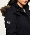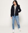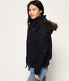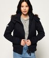 Superdry women's microfibre faux fur hooded SD-Windbomber jacket. This jacket features a triple zip main fastening, two zip fastened pockets and a quilted body lining. This jacket also features a removable faux fur trim on the hood, a hook and loop fastening on the collar and a ribbed collar, hem and cuffs with thumbholes. Finished with a rubberised Superdry logo on one sleeve.