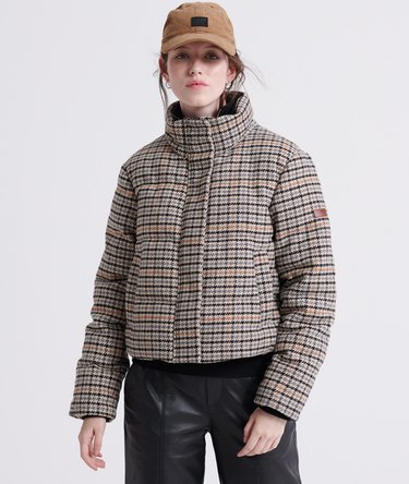 Superdry women's Quake puffer jacket. Get the retro look with this 70's inspired dogtooth pattern puffer jacket, featuring a main zip and popper fastening, two popper fastened pockets, a bungee cord adjustable hem and elasticated cuffs. Completed with a faux leather Superdry logo badge on one sleeve.