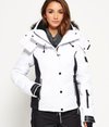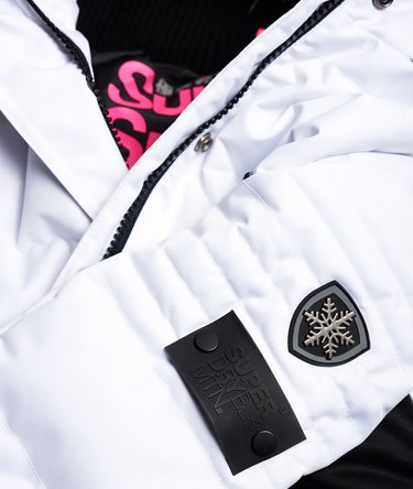 Superdry womens’s Snow puffer jacket from the Superdry Snow collection. This padded snow proof jacket complete with an inner ribbed collar, a detachable hood that has taped seams to help keep the moisture out , a double-layer zip with popper fastening and a zipped ski pass holder. The Snow puffer jacket also features two outer fleece lined zipped pockets, two inner pockets including a tech pocket with earphone routing and a detachable goggle cloth. Inside the puffer jacket there is a removable snow skirt and snow cuffs to help keep the powder out and the warm in. The jacket is finished with Superdry branding on the sleeve and pockets.