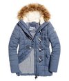 Superdry women's Tall Marl Toggle Puffer Jacket. A warm, quilted jacket featuring a soft fleece lining, a bungee cord hood with sherpa lining and a faux fur trim, zip and toggle fastening, two outer zipped pockets and elasticated cuffs. The jacket is finished with with an embroidered Superdry logo on the shoulder and a logo badge on the sleeve.