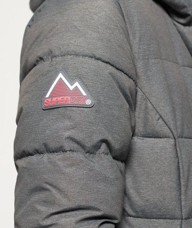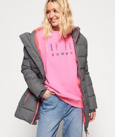 Superdry women's Tall Sports puffer jacket. Refresh your outerwear this season with the Tall Sports puffer jacket, featuring a bungee cord adjustable hood, zip fastening and two zipped front pockets. The jacket also features ribbed cuffs and a fleece lined hood and body for warmth. The jacket is completed with rubbed logo badges on the sleeve and hem and logo branding on the placket.