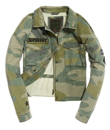 Superdry women’s Utility crop jacket. A military inspired cropped jacket featuring a front zip and popper fastening, two front popper fastened pockets and popper fastened cuffs. The jacket also features an unfinished hem, applique logo badges on the arm and is finished with an applique Superdry logo badge above one of the pockets.