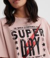 Superdry women's Sheri Band graphic t-shirt. This crew neck style t-shirt features an oversized fit with short sleeves and a glitter Superdry graphic on the chest. This is finished with a Superdry tab on the hem. Layer with jeans and trainers for a stylish look this season.