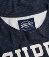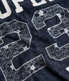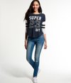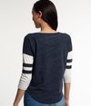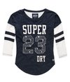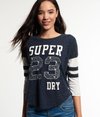 Superdry women's Football Lace Embroidery Top. A cute twist on a classic football style top featuring 3/4 length sleeves, a Superdry cracked print with 23 lace embroidery on the front chest and striped sleeves. The Football Lace Embroidery top has a curved hem and is finished with a Superdry logo badge above the hem.